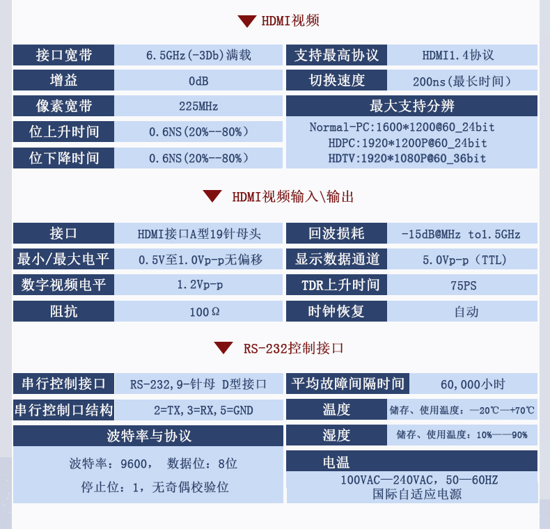 帶長線驅(qū)動功能--- HDMI及DVI輸入端帶數(shù)字均衡調(diào)整電路,輸出帶信號預(yù)加重增強電路,使信號能進行更長距離傳輸,輸入輸出都可超過35米距離;